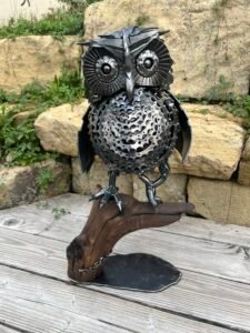 Chouette née de métal recyclé elle déploie ses ailes dans un équilibre entre nature et industrie.