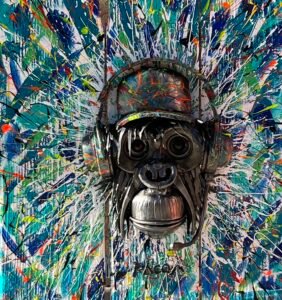 Un singe d’acier, coiffé d’un casque de gamer, trône au coeur d’un univers en fusion.